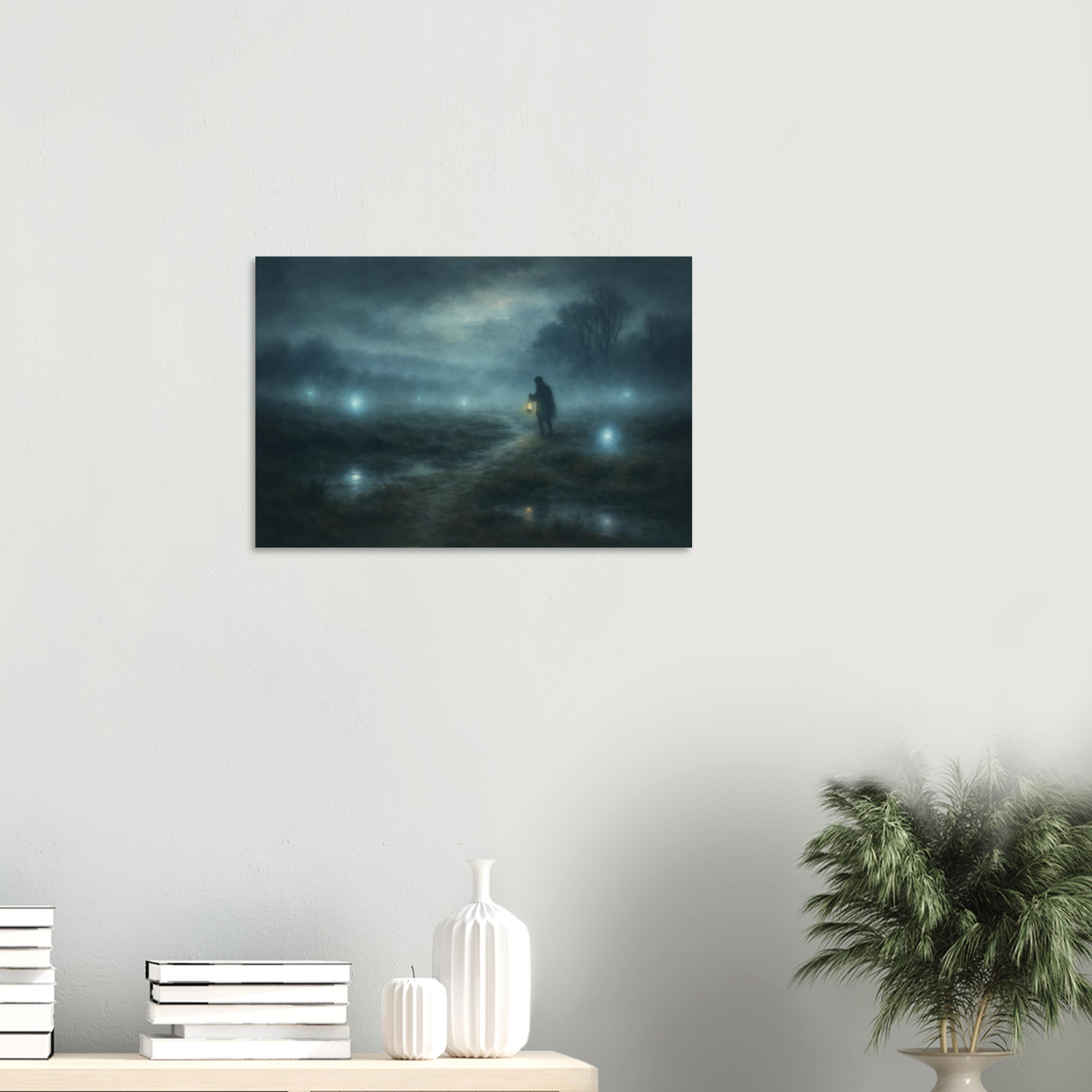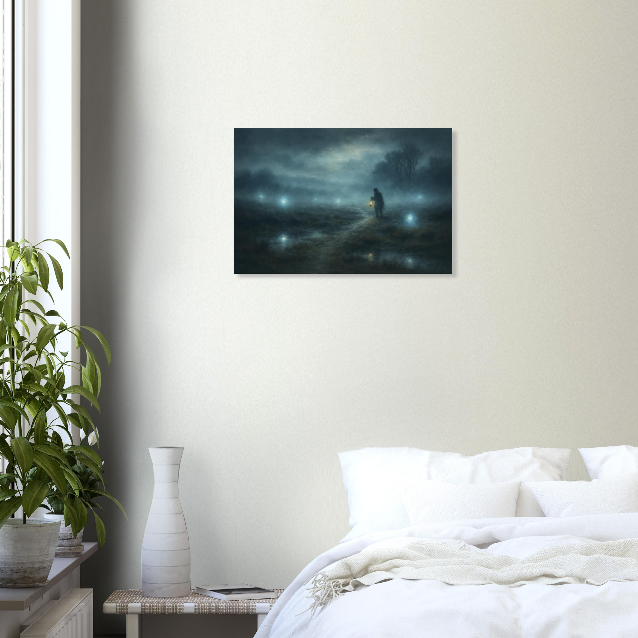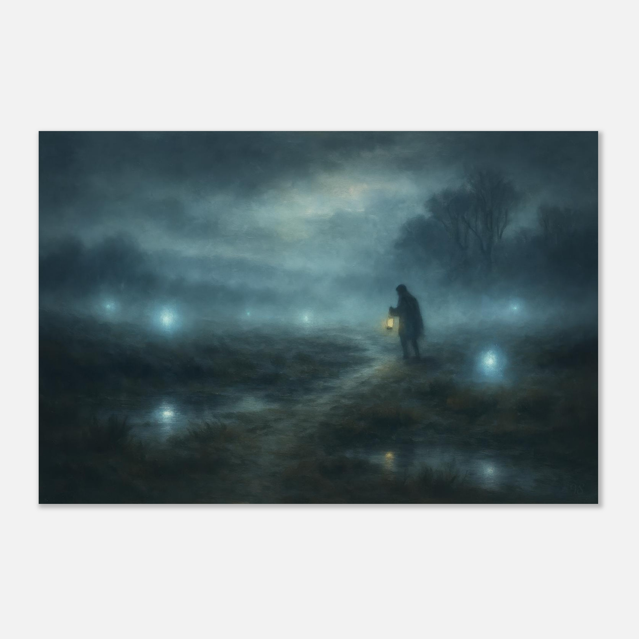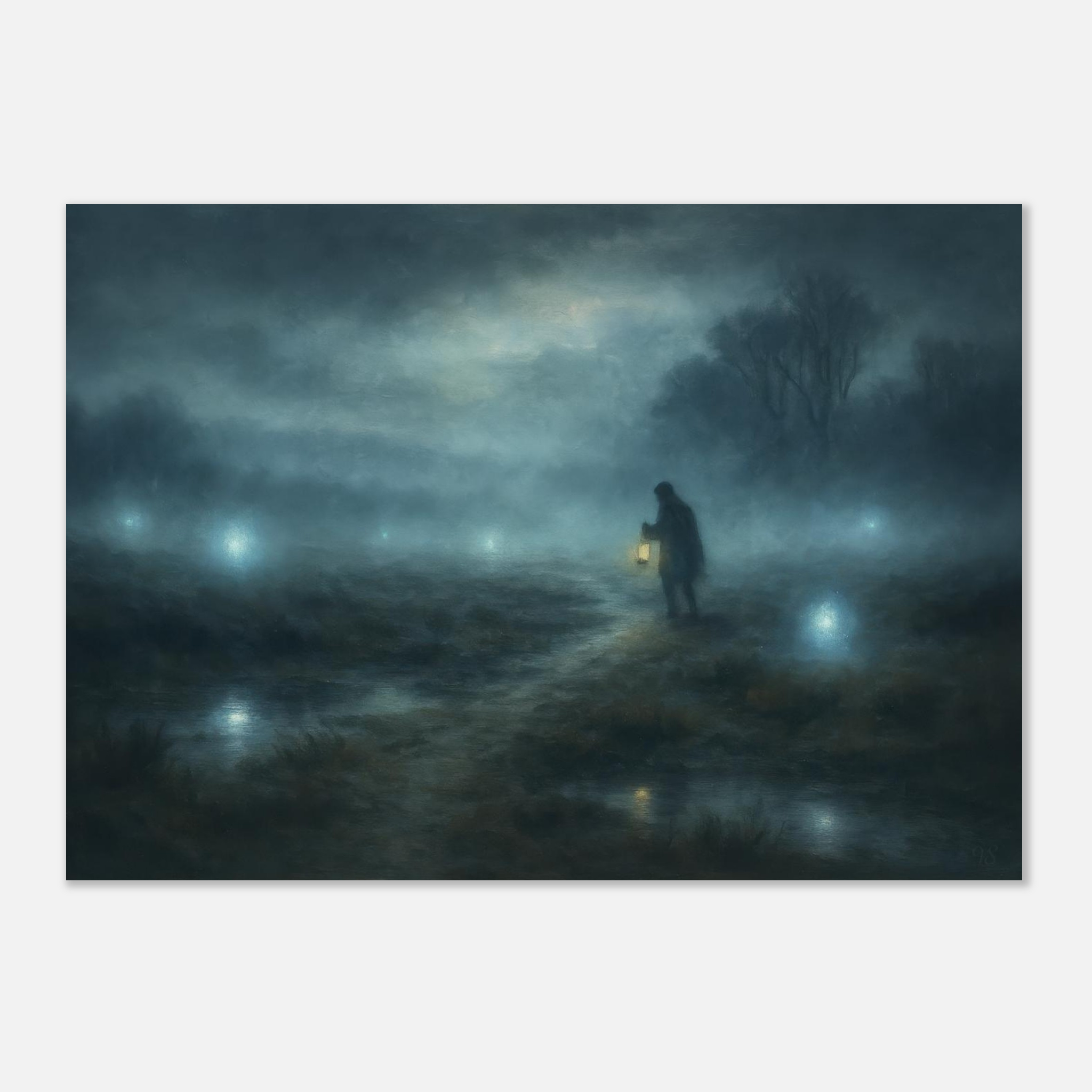 A painterly gothic print from the All Hallows in the North series – inspired by Scottish folklore, moorland mists, and the lantern-glow of the unseen.